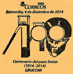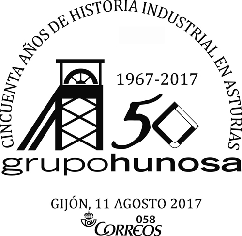 carbón de Riosa y Morcín dando comienzo su explotación el 24 de abril de 1846". En la primera década del siglo XX estas minas vivirán frecuentes cambios en su razón social, así en el año 1903 las tenemos en poder de la compañía Minas de Riosa, tres años después su propietaria es la Compañía Hulleras de Ujo-Mieres En 1911 la razón social está ya en manos de la Societé Française des Carbonnages de Laviana. En 1915 estas minas son adquiridas en subasta pública por la Sociedad Hulleras de Riosa bajo la cual hallarán un prolongado periodo de estabilidad y progreso ampliando los grupos en explotación y construyendo un moderno sistema de clasificación, lavado y cargue en La Pereda así ferrocarril minero cuyo espectacular trazado de 9 km ofrece hoy un gran potencial turístico-arqueológico. En 1952 la empresa nacional Ensidesa se hizo cargo de las minas y poco después, en 1955 se inicia la profundización del pozo Montsacro justo en el limite entre los concejos de Morcín y Riosa. Durante la profundización se producirá el primer muerto del nuevo pozo, Ángel García, en el cual rendimos homenaje a las tragedias vividas aquí, en especial las del año 1967 cuando dos catástrofes consecutivas segaron la vida de 8 mineros riosanos y morciniegos. El 1 de julio de 1969 la Sociedad Minas de Riosa se íntegra en HUNOSA con la cual el pozo Montsacro vivió una extraordinaria transformación integrándolo en una gran unidad productiva junto con el vecino San Nicolás extrayendo sus producciones conjuntamente al lavadero Batán, en Mieres, a través del gran Túnel de Sueros. Actualmente el pozo Montsacro alcanza 373 metros de profundidad y se haya dividido en 7 plantas equidistantes 50 m. Su imagen es una de las más inconfundibles de la cuenca asturiana, no sólo por la plataforma de embarque elevada sino por el horizonte de caliza que presenta casi desde cualquiera de sus perspectivas. (Organiza GRUCOMI. Diseño del matasellos M.A. de Blas Cortina: dibujo C.M. López: texto Pedro Fandos R.) (Foto cedida por Ángel García Díaz).