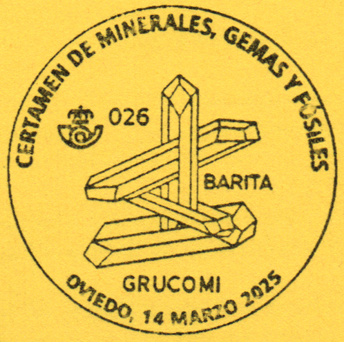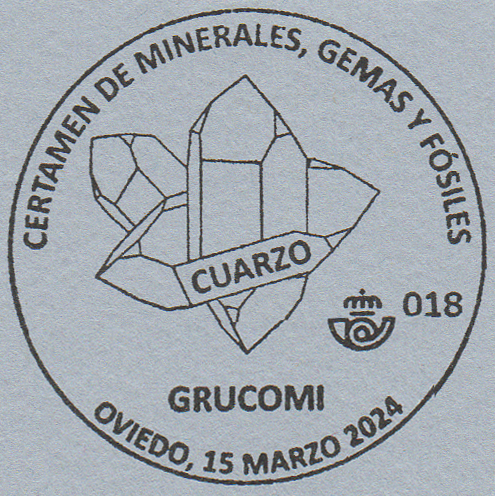Las primeras referencias sobre la existencia en Asturias de fluorita (Fluoruro de Calcio) se remontan a Schulz (1838,1858) y a Fuertes Acevedo (1884). Sin embargo, el inicio de su explotación no dio comienzo hasta después de la Guerra Civil. Las minas asturianas de fluorita han suministrado cristales de la misma categoría e incluso superiores a los célebres de las minas inglesas de Kumberlan, Durham, Alston, etc. Llegaron a existir 11 empresas productoras, situándose las principales explotaciones en Caravia, Berbes, Sierra del Sueve, La Collada, Arlós, Villabona y Solís, donde aún subsiste la última explotación (mina Moscona, una de cuyas fluoritas apareció en un sello de Correos en 1996). El boom de la fluorita sería tan espectacular que en los años 1960 y 70, Asturias llegaría a entrar en el ranking minero mundial (España llegaría a ser el 2º exportador y el 7º productor mundial, aportando Asturias el 70% nacional). El fluor se emplea en la fabricación de esmaltes, dentífricos, lubricantes, plásticos (teflón) y gases para distintos usos (aerosoles, frigoríficos). Pero la crisis del mercado comenzó en 1978 cuando se acusó a los productos clorofluorados de dañar la capa de ozono. Asturias mantiene las principales reservas españolas de fluorita. (Diseño y redacción: Pedro Fandos Rodríguez (GRUCOMI). Agradecemos a GRUFIA y a Correos el premio que nos ha permitido la emisión de este matasellos. Fuentes: Enciclopedia Los Minerales, Ed. Nueva Lente, Madrid 1983, pag, 1999. Recursos del Subsuelo de Asturias, Manuel Gutiérrez Claverol y Carlos Luque Cabal, 1994, pag 132-140)